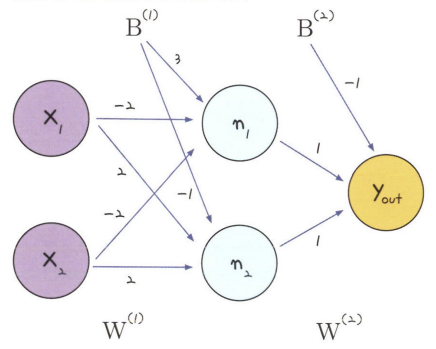 : 퍼셉트론이나 아달라인은 모두 2차원 평면상에 직선을 긋는 것만 가능합니다. 이 예시는 경우에 따라 선을 아무리 그어도 해결되지 않는 상황이 있다는 것을 말해 줍니다. ( 각각 엇갈려 놓인 검은색 점 두개와 흰색 점 두 개를 하나의 선으로 구별x )