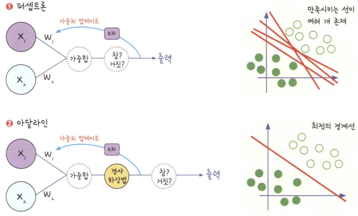 - 아달라인: 퍼셉트론에 경사 하강법을 도입해 최적의 경계선을 그릴 수 있도록 함.