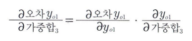 W31에 대해 오차를 편미분 하는 것은 합성 함수(함수 안에 또 다른 함수가 들어 있는 것을 의미) 미분 공식을 따릅니다. 즉, 체인 룰에 의해 다음과 같이 계산할 수 있습니다.