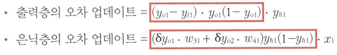 - 두 식 모두 '오차 * out(1 - out)' 형태, 즉 델타식의 형태로 단순화할 수 있습니다.