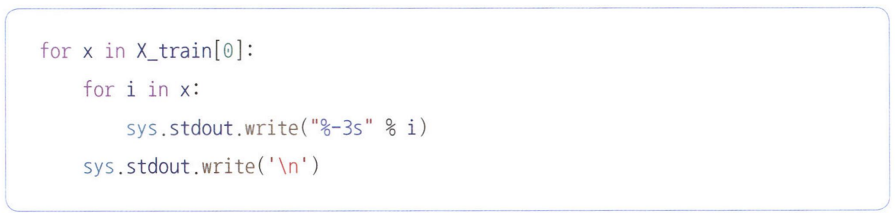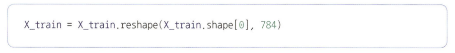 이제 이것을 속성을 담은 데이터를 딥러닝에 집어넣고 클래스를 예측하는 문제로 전환시킵니다. 28 x 28 = 784개의 속성을 이용해 0 ~ 9의 클래스 열 개 중 하나를 맞히는 문제가 됩니다. 이제 주어직 가로 28, 세로 28의 2차원 배열을 784개의 1차원 배열로 바꾸어 주어야 합니다. reshape(총 샘플 수, 1차원 속성의 개수) 형식으로 지정합니다. 총 샘플 수는 앞서 사용한 X_train.shape[0]을 이용하고, 1차원 속성의 개수는 이미 살펴본 대로 784개입니다.