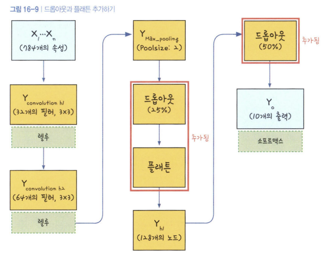 이런것들을 앞에서 Dense() 함수를 이용해 만들었던 기본 층에 연결해보자. 이때 주의할 점은 컨볼루션 층이나 맥스 풀링은 주어진 이미지를 2차원 배열인 채로 다루기 때문에 이를 1차원 배열로 바꾸어 주어야 활성화 함수가 있는 층에서 사용할 수 있습니다. Flatten() 함수를 사용해 2차원 배열을 1차원으로 바꾸어 줍니다.