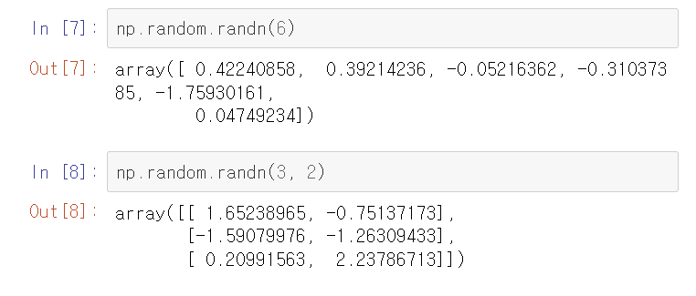 np.random.randn(m,n): 평균0, 표준편차 1의 가우시안 표준정규분포 난수를 matrix array(m,n) 생성
